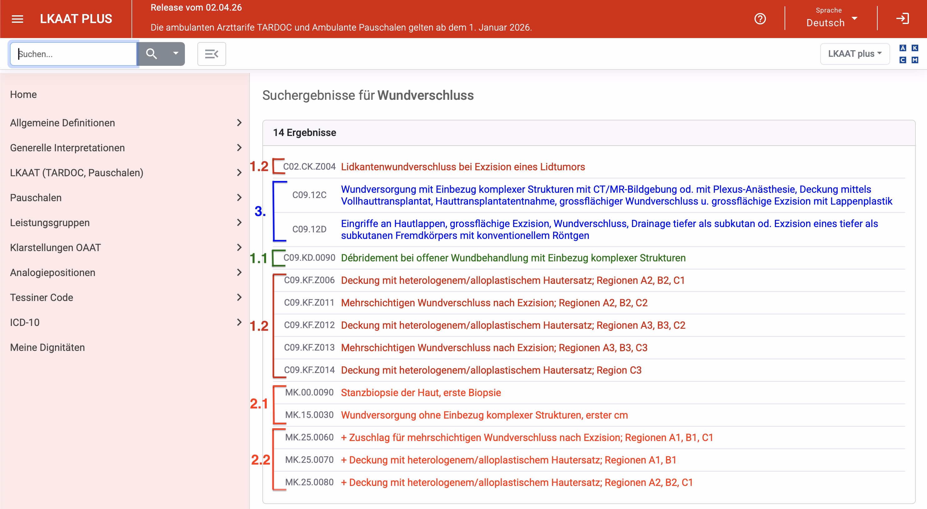 Die tarifliche Einordnung erfolgt im Browser über die farbliche Darstellung der Leistungen und Pauschalen. Zusätzlich sind TARDOC-Positionen an ihren unterschiedlich langen LKN-Nummern erkennbar.